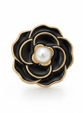 The design features a sculpted rose shape with glossy black enamel petals outlined in warm gold-tone metal. At the very center sits a delicate white faux pearl, providing a classic contrast to the dark petals.