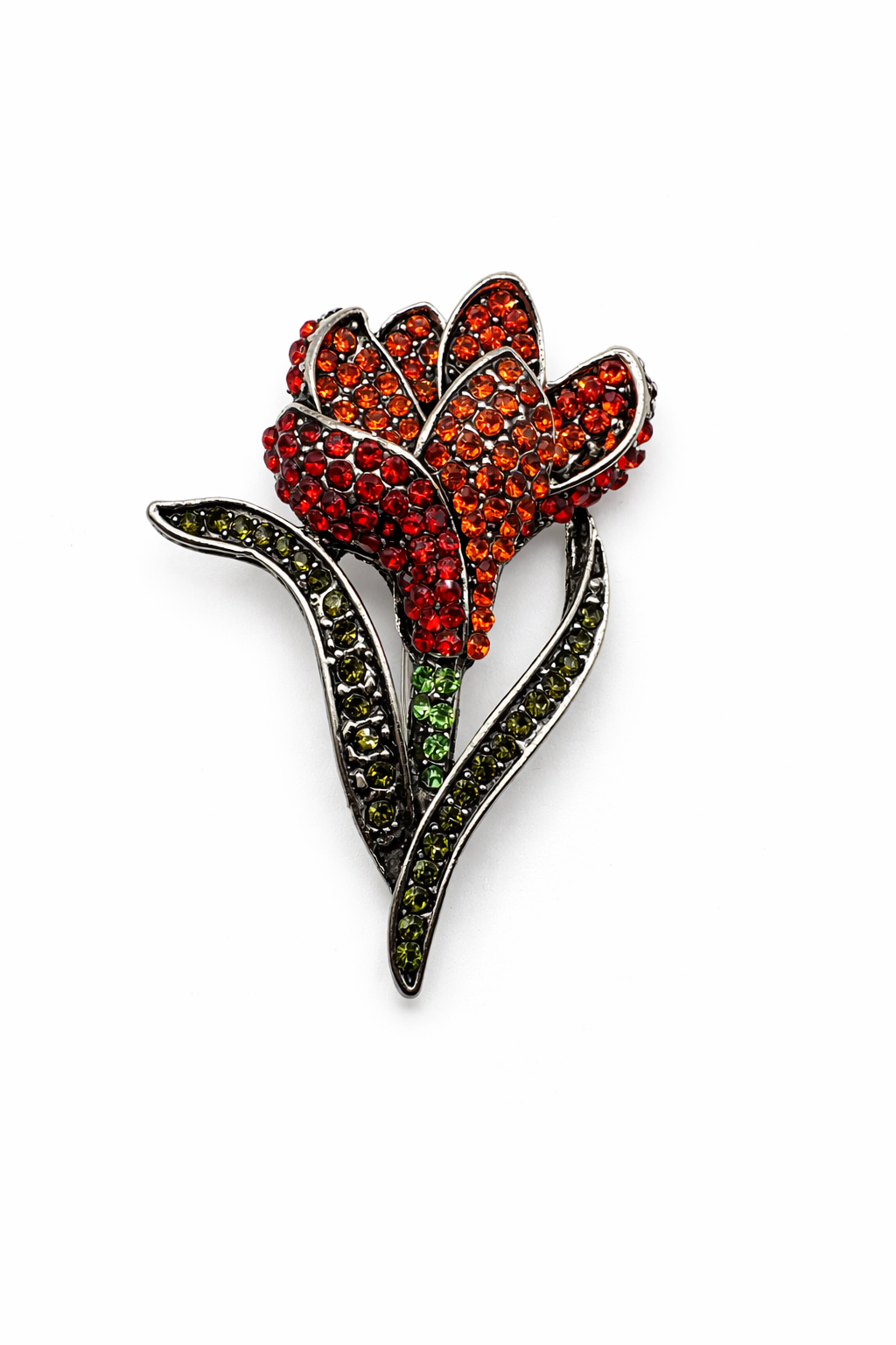 Add a dazzling floral touch to your look with our Crystal Pave Tulip Brooch. Set in an elegant dark gunmetal finish, this stunning tulip is entirely encrusted with sparkling rhinestones that catch the light beautifully.