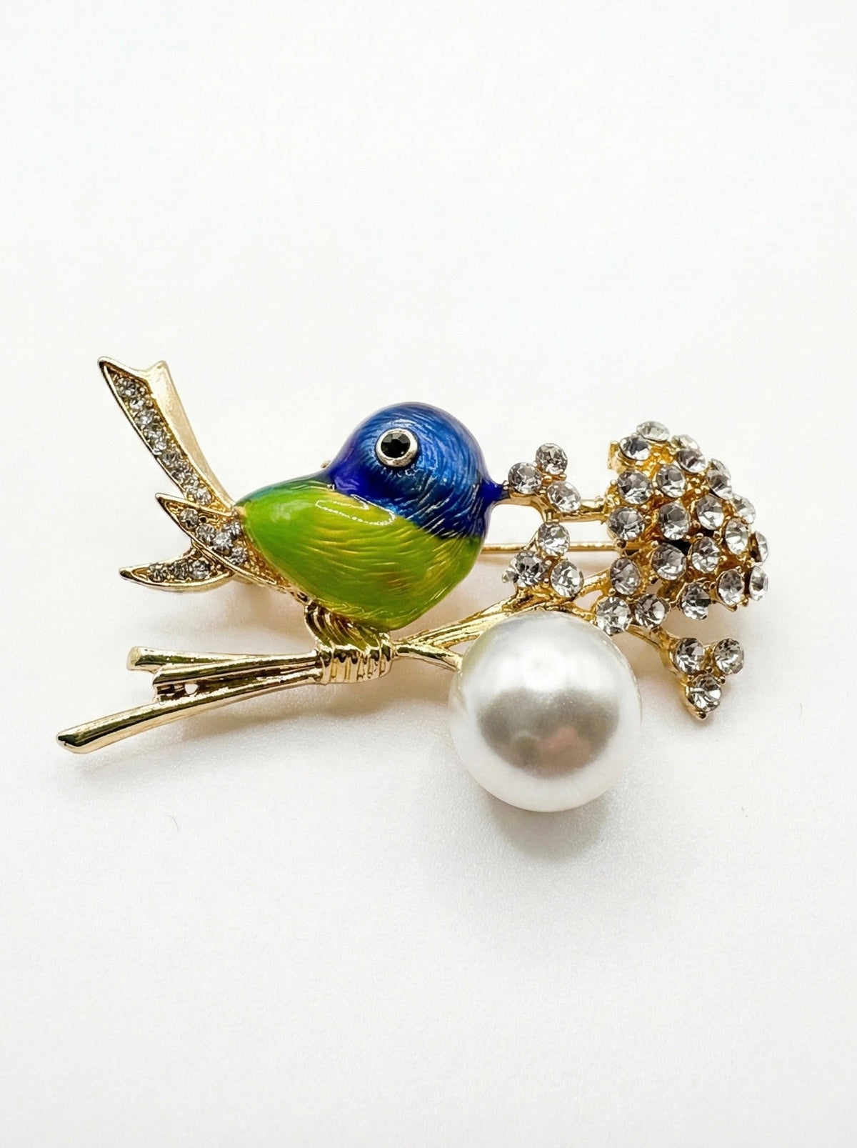 The design is anchored by a large, lustrous faux pearl hanging below the branch, adding a classic touch to the colorful enamel work. The bird's tail is also accented with tiny crystals for extra shine. It’s a sophisticated piece that looks beautiful on formal wear, scarves, or as a unique gift.
