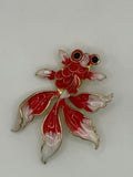 The design features a "fancy goldfish" silhouette with large, expressive eyes and intricate scale details. The body is hand-painted in vibrant cherry-red enamel that transitions seamlessly into creamy, pearlescent white tail fins. The flowing shape of the tail gives the piece a sense of movement, as if it is swimming gracefully through water.