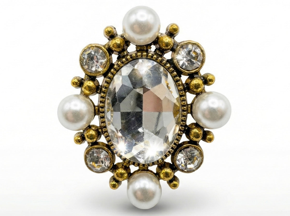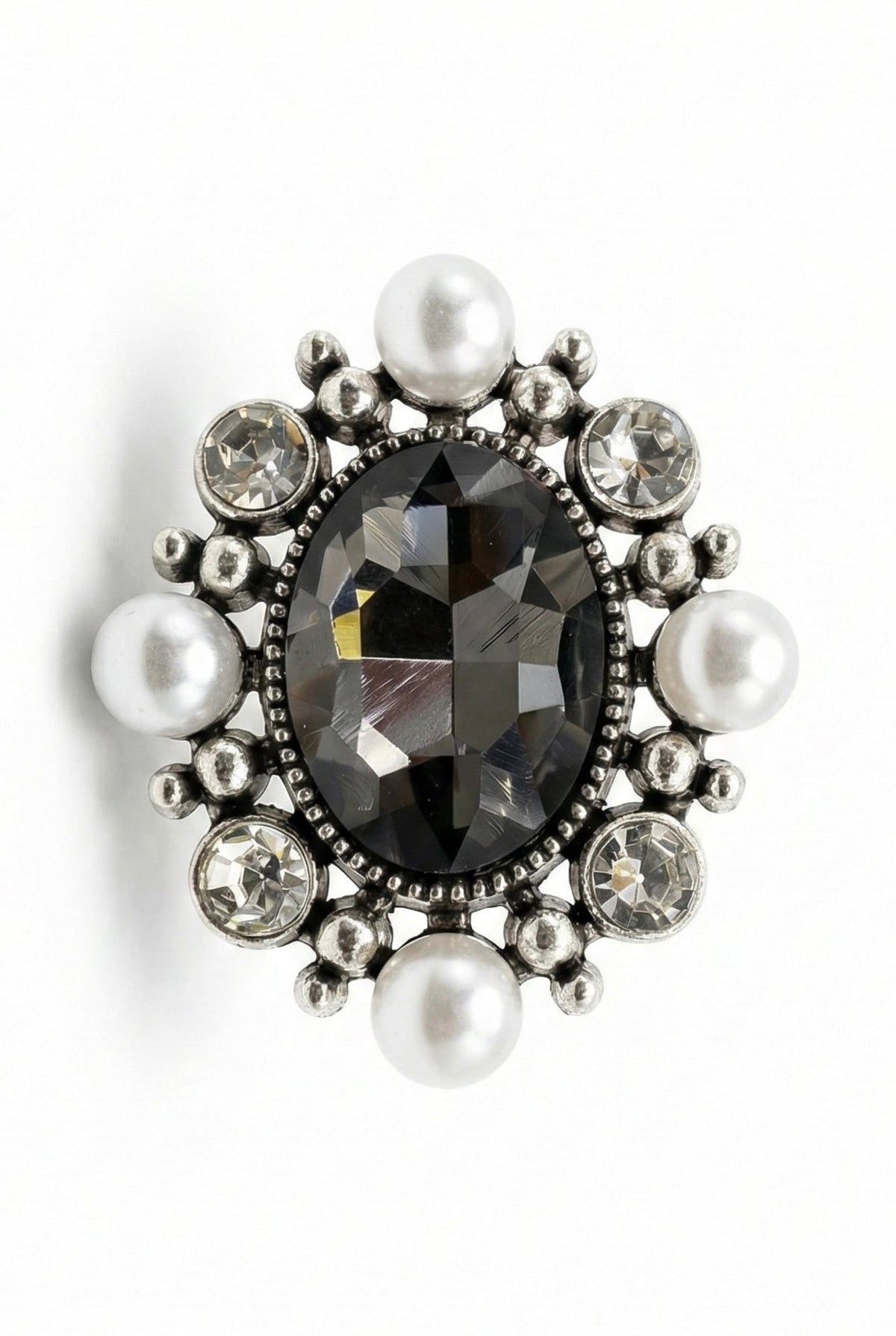 The button features an elegant oval shape with a central crystal surrounded by a halo of rhinestones and four outer pearls.