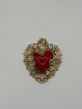 The centerpiece is a glossy, vibrant red enamel heart with a delicate heart outline traced in the center. It is framed by elaborate gold-tone filigree scrolls and crowned with the classic "flaming heart" motif.