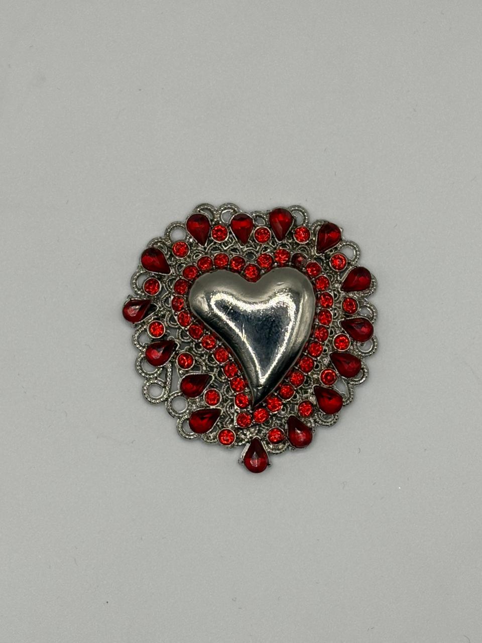 This striking piece features a puffed silver/gold-tone metallic heart at the center, surrounded by intricate filigree metalwork. It is rich with color, embellished with a halo of sparkling ruby-red crystals—small round stones frame the center, while dramatic red teardrop gems crown the outer edges.