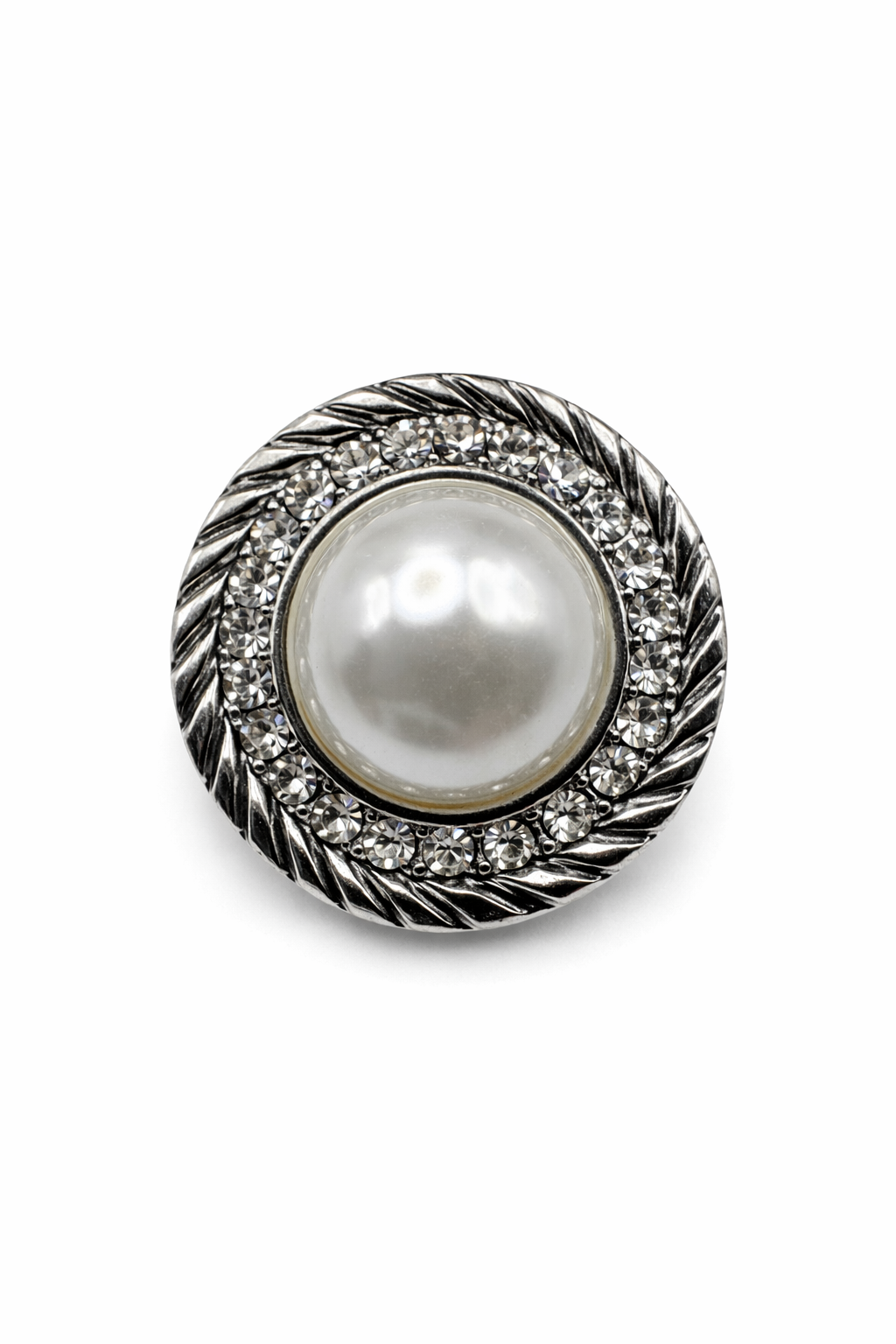 • Design: Pearl center, crystal halo, twisted silver rope rim.